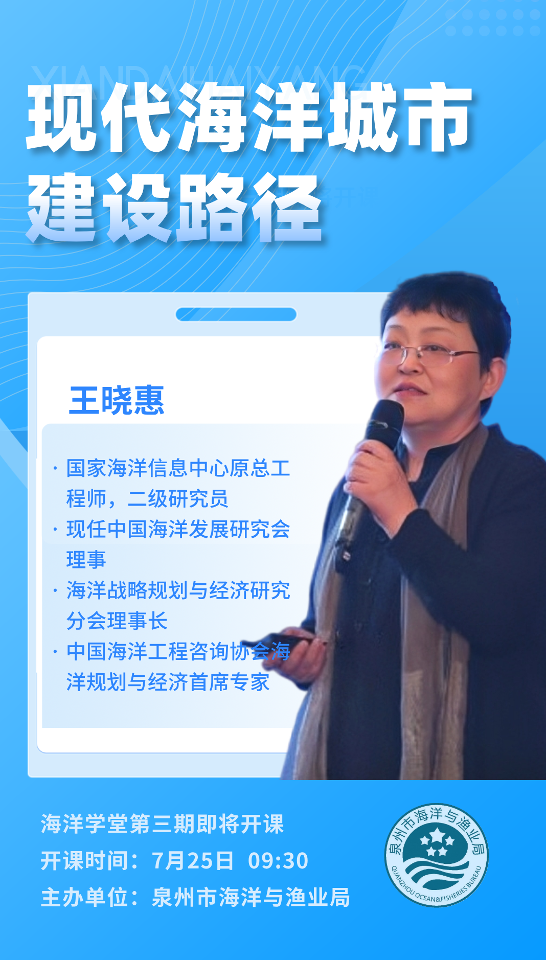 7月25日,市海洋渔业局将邀请国家海洋信息中心研究员王晓惠为全体干部职工开展第三期海洋学堂专题讲座。届时,王晓惠将以前沿视角深入解析现代海洋城市的内涵、发展瓶颈及战略方向,提升全体干部职工对现代海洋城市建设的理解和实践能力。